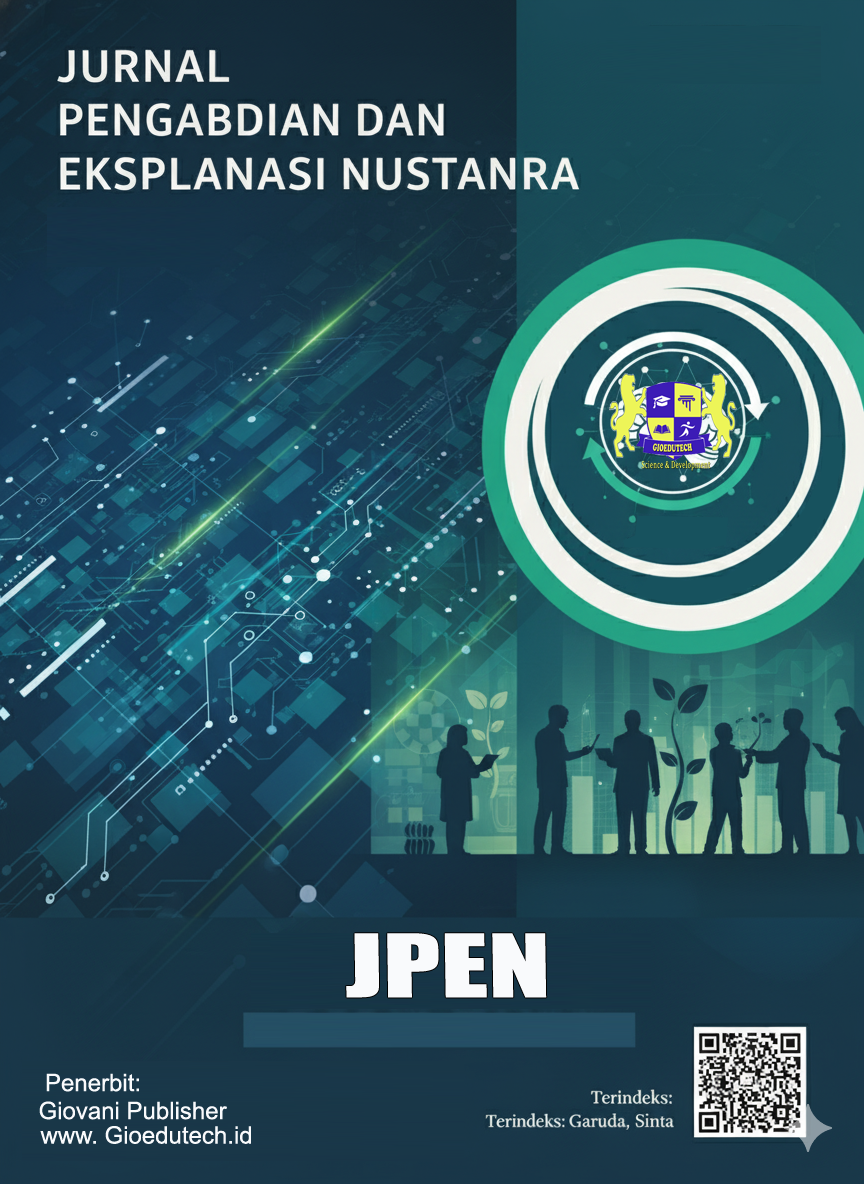Jurnal Pengabdian dan Eksplanasi Nusantara diterbitkan oleh Gio vani Publisher dengan Nomor AHU-063269.AH.01.30 Tahun 2024. . Jurnal ini merupakan jurnal ilmiah terbitan berkala yang telah melalui proses telaah sejawat (peer-reviewed) dalam bidang pemberdayaan masyarakat dengan cakupan bidang: Jurnal ini diharapkan dapat menjadi alat informasi dan sosialisasi mengenai hasil-hasil pengabdian dari seluruh sivitas akademika tentang berbagai macam inovasi dan solusi-solusi dalam berbagai permasalahan dalam masyarakat. Focus jurnal yaitu: (Pengembangan teknologi berwawasan lingkungan), (Pengembangan ekonomi, Kewirausahaan, Koperasi,KKN, Industri Kreatif, dan UMKM), (Pembangunan manusia dan daya saing bangsa), (Kesehatan, gizi, penyakit tropis, dan obat-obatan herbal, seni, sastra, dan budaya, serta integrasi nasional dan harmoni sosial), (Pengelolaan wilayah pedesaan dan pesisir berkearifan lokal).